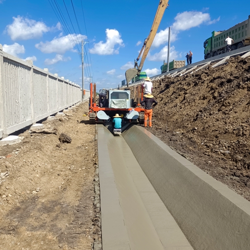 HMJ5000 adjustable canal paver can pave maximum 5m wide and 2m high canals. Automatically steering control and speed control.